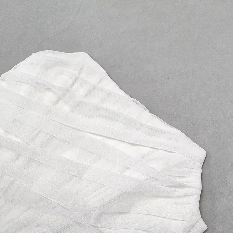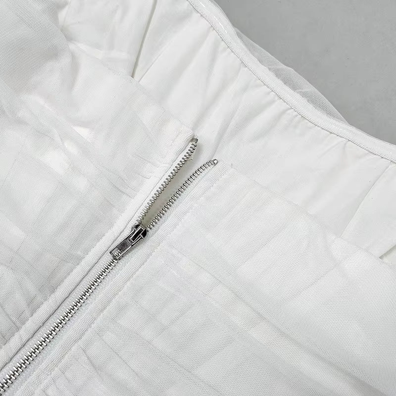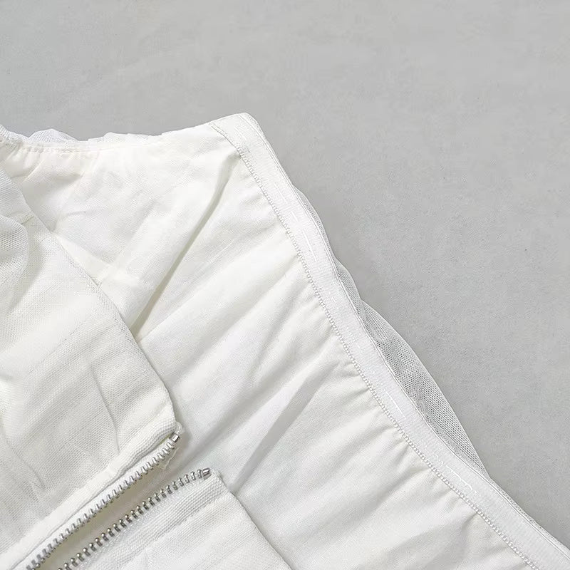 Its elegant mesh fabrication features a practical rear zipper closure for effortless dressing.