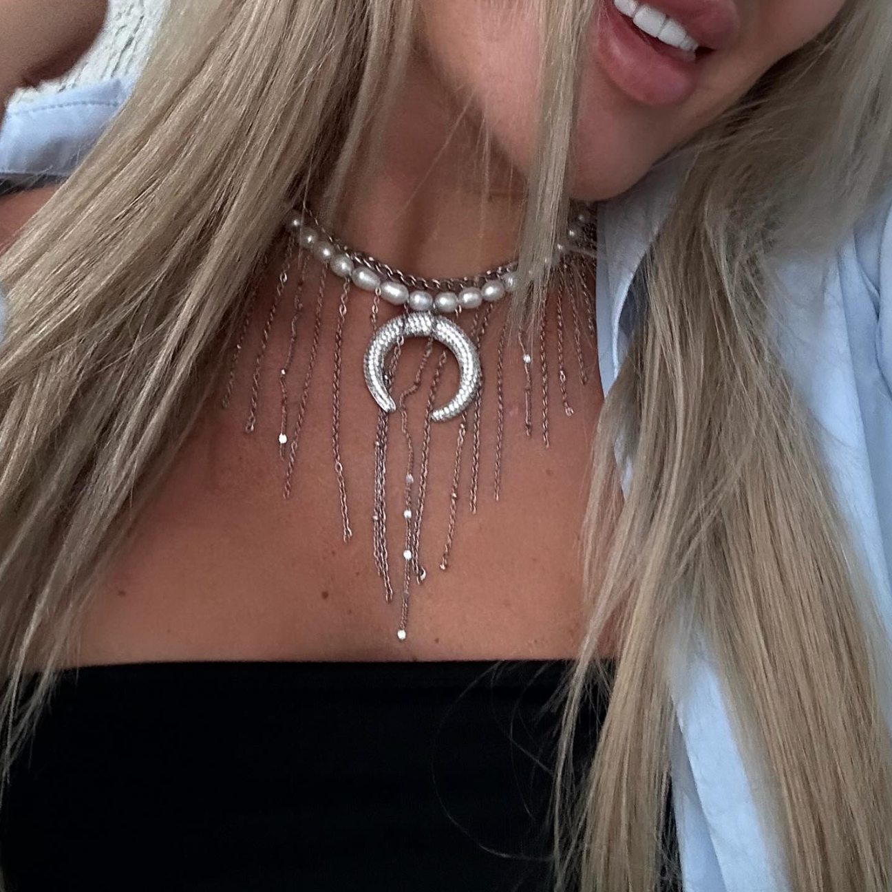 The Neckless Mi Luna presents an exquisite pearl composition, featuring meticulously selected lustrous elements arranged in a sophisticated lunar-inspired design.